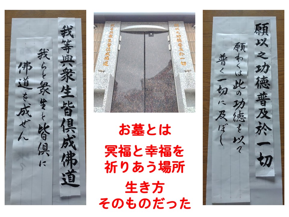 この一文は法華経をお唱えする宗派の回向文。いわばお経の一節。宗派が違うと言い回しが若干異なりますが、意味合いは同じ。意味は「私の善い行いの果報が、この世の中のありとあらゆる存在すべてに広く行きわたり、私を含めたすべての人と、生きとし生けるものとが、お互いに対して深い慈しみの心を持って、自ら勤め励む道をたえまなく進んでいくことを願います」となるそうです。